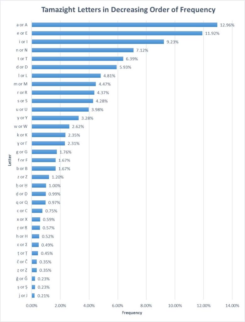 - Lettres rares : C, X, Ṛ, H, Ɛ, Ṭ, Č, Ẓ, Ǧ, Ṣ, J (moins de 1 % chacune).